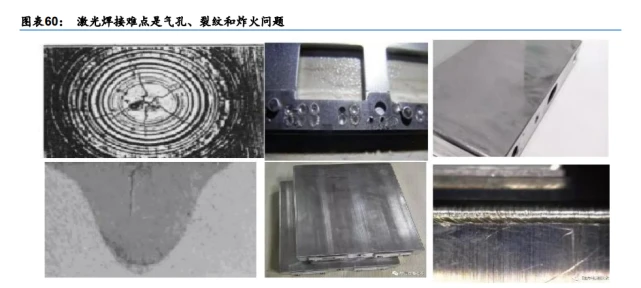 激光焊接工藝難點:鋁合金對激光的反射率極高, 焊接過程中氣孔敏感性高, 焊接問題主 要的是氣孔、熱裂紋和炸火。此外,軟包極耳焊接要求高水平的焊接工裝,壓牢極耳,保 證焊接間隙。 圓柱電芯的焊接主要是正極的焊接,采用激光焊接。負極的部分殼體薄,容易焊穿,采用 負極免焊接的方式。方形電池的焊接主要分為側(cè)焊和頂焊,側(cè)焊對電芯內(nèi)部的影響較小, 飛濺物不會輕易進入殼蓋內(nèi)側(cè),但對激光器的穩(wěn)定性、材料的潔凈度等要求極高。