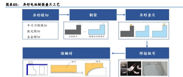 由于形狀限制,異形電池采用制袋疊片工藝。異形鋰電池的前端制漿、涂布、軋片相同和 普通疊片鋰電池基本相同,差別在于制片模切到抽氣之間,并且普通的模切和 Z 字疊片無 法適用。 制造工藝如下:1)異形模切;2)制袋:用隔膜將正極極片包裹,制袋后極片位置固定方 便后續(xù)疊片;3)異形疊片:將正負極片按負極-正極-負極的順序疊放;4)焊接極耳:要 解決電池定位和極耳定位的問題;5)頂側(cè)封:異型電池大多較小,頂側(cè)封可一次完成。