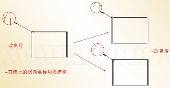 產(chǎn)品拐角的設(shè)計,一般設(shè)置為圓角或鈍角,避免銳角,直角,如下圖: