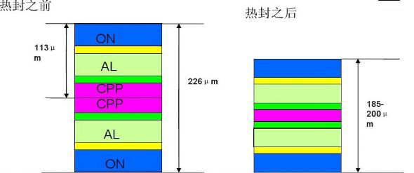 封裝厚度過大或過小都不利于鋁塑膜的封裝,厚度過大本質(zhì)上是鋁塑膜沒有封裝好,在設(shè)備方面可能由于壓力小或傳感器異常,壓縮空氣氣壓不穩(wěn)定。封裝厚度過小則意味著過封了,可能會(huì)導(dǎo)致PP層過融,露出鋁層。在設(shè)備上可以加裝相應(yīng)的限位裝置以達(dá)到最佳的封裝效果。此外溫度傳感器異常時(shí)也會(huì)導(dǎo)致達(dá)不到設(shè)定的工藝溫度而引起過封或欠封,導(dǎo)致封裝不良。