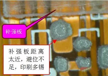 補(bǔ)強(qiáng)板和背膠在設(shè)計(jì)時(shí)需要考慮與焊盤的距離,否則沉槽的避位距離不足,引起印刷多錫、連錫。如下圖。