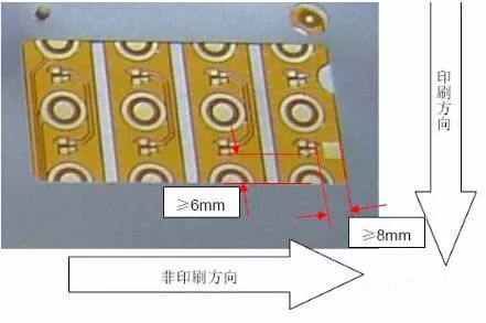 其次,可將壓片的開口做大來減少壓片厚度的影響,推薦壓片開口邊緣與焊盤邊緣的距離為:印刷方向至少8mm,非印刷方向至少6mm。