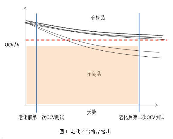 極片上的顆粒或微量金屬殘渣、隔膜上的微小缺陷、電芯在組裝過程中引入的粉塵等,都會造成電芯內部微短路。對于微短路電芯,僅通過容量及一次電壓是無法完成篩選的,因此必須引入K值測試:通過精確計算其電壓降速率來判斷電芯是否存在微短路情況,如圖1所示。