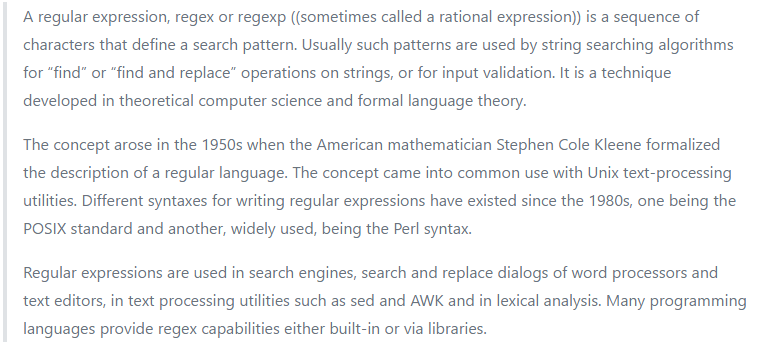 接下來(lái)我們會(huì)看到更多的示例。同時(shí),也會(huì)看到C++正則表達(dá)式API的更多功能。 為了便于下文示例的講解,我們以維基百科上對(duì)于正則表達(dá)式的介紹文本為基礎(chǔ)。