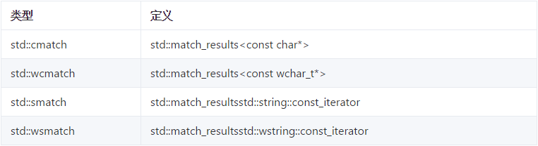 std::match_results用來(lái)存儲(chǔ)匹配結(jié)果。與迭代器類似,匹配結(jié)果也有四種類型: