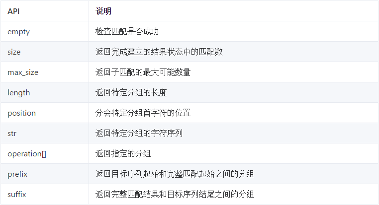 這些分組最終可以在匹配完成之后,可以通過(guò)std::match_results的API來(lái)獲取。這些API如下表所示: