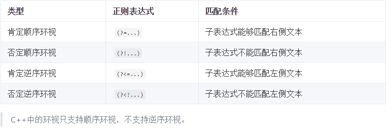 環(huán)視是對(duì)匹配位置的附加條件,只有條件滿足時(shí)才能完成匹配。環(huán)視有:順序(向右),逆序(向左),肯定和否定一共四種: