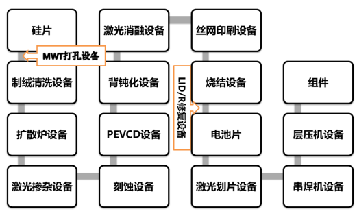應(yīng)用金屬穿孔卷繞技術(shù)進(jìn)行激光打孔,將電池正面電極搜集的電流通過孔洞中的銀漿引導(dǎo)背面,而消除正面電極的主柵線,從而減少正面柵線的遮光。由于MWT電池較為小眾,該設(shè)備僅在日托光伏等企業(yè)有少量應(yīng)用。