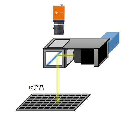 激光打標(biāo)系統(tǒng)采用偽同軸結(jié)構(gòu),由半透半反棱鏡將側(cè)面射出的激光折射90°,垂直向下。CCD從上往下拍攝,透過半透半反棱鏡拍攝CCD下方的IC產(chǎn)品,進(jìn)行圖像分析定位。相機(jī)將計(jì)算出的像素坐標(biāo)轉(zhuǎn)換為激光器的物理坐標(biāo),控制激光器振鏡偏轉(zhuǎn)實(shí)現(xiàn)定位打標(biāo)。