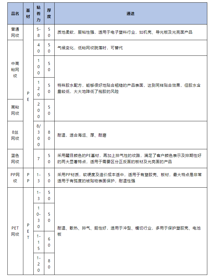 網(wǎng)紋保護(hù)膜有普通和防靜電兩種,顏色有透明、紅色和藍(lán)色等,不同材料表面的保護(hù)可選擇不同的產(chǎn)品型號粘力和規(guī)格。
