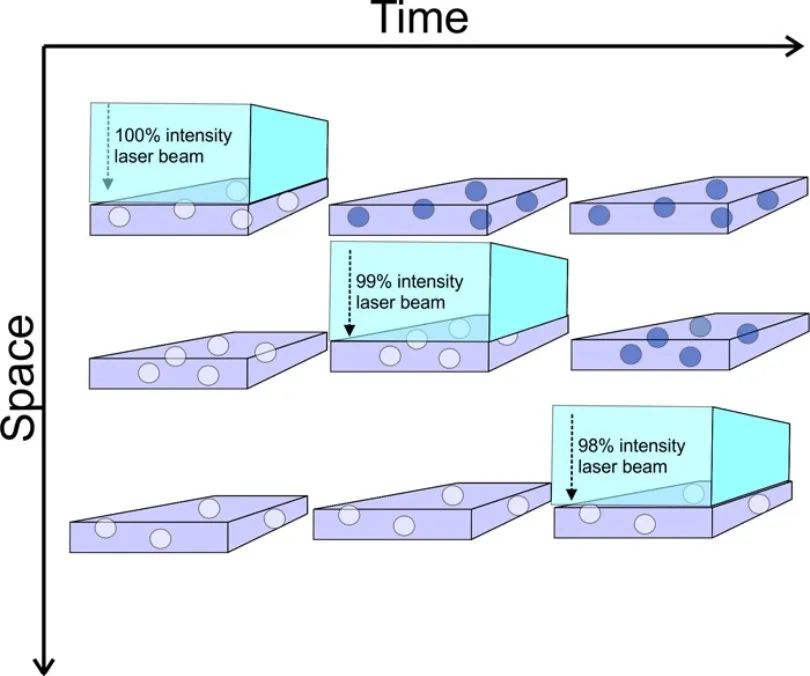 圖4說明了空間和時(shí)間的過程。入射激光束自由穿透第一層材料層,在與原始白色TiO2顆粒相互作用時(shí)損失其總能量的一小部分(例如,1%),將它們變成黑色。同樣的事情發(fā)生在第二層,依此類推,直到大部分激光脈沖能量在頂部50-100層內(nèi)被吸收。實(shí)際上,該過程在時(shí)間和空間上都非常有限,因?yàn)榭偯}沖持續(xù)時(shí)間通常低于30ns,標(biāo)記深度不超過50um左右。