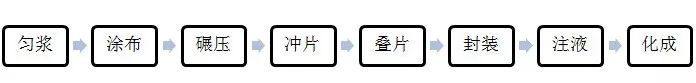 鋰離子電池生產(chǎn)過程較為復雜,以萬向一二三為例,主要包括:勻漿、涂布、碾壓、沖片、疊片、封裝、注液、化成幾個工序。如下圖所示。