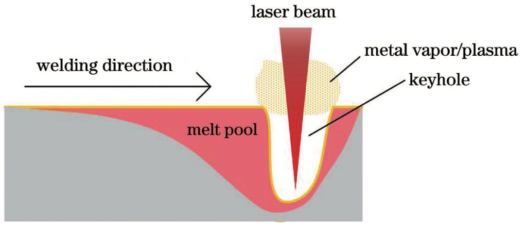 激光深熔焊工藝原理(圖1)如下:當(dāng)激光功率密度達(dá)到一定水平時,材料表面發(fā)生氣化,從而形成匙孔。當(dāng)孔內(nèi)金屬蒸氣壓力與四周液體的靜壓力和表面張力達(dá)到動態(tài)平衡時,激光可通過匙孔照射到孔底,隨著激光束的運動,形成連續(xù)的焊縫。在激光深熔焊焊接過程中,不需要添加輔助焊劑或填料,即可將工件自身材料焊接為一體。
