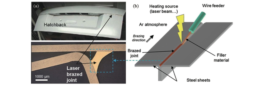 圖3 激光釬焊在汽車中的應(yīng)用:(a)后車蓋激光焊接;(b)激光釬焊原理圖