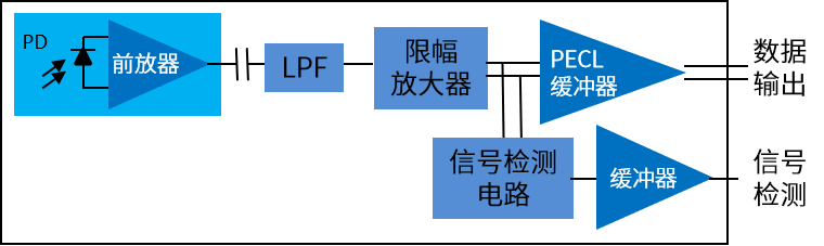 光接收部分以PIN為例,是由PINTIA(InGaAs PIN和跨阻放大器)和限幅放大器組成。將輸入的光信號(hào)通過PIN管轉(zhuǎn)換成光電流,光電流又通過跨阻放大器轉(zhuǎn)換成電壓信號(hào)。電壓信號(hào)經(jīng)限幅放大,并通過整形濾波器與限幅放大器產(chǎn)生差分