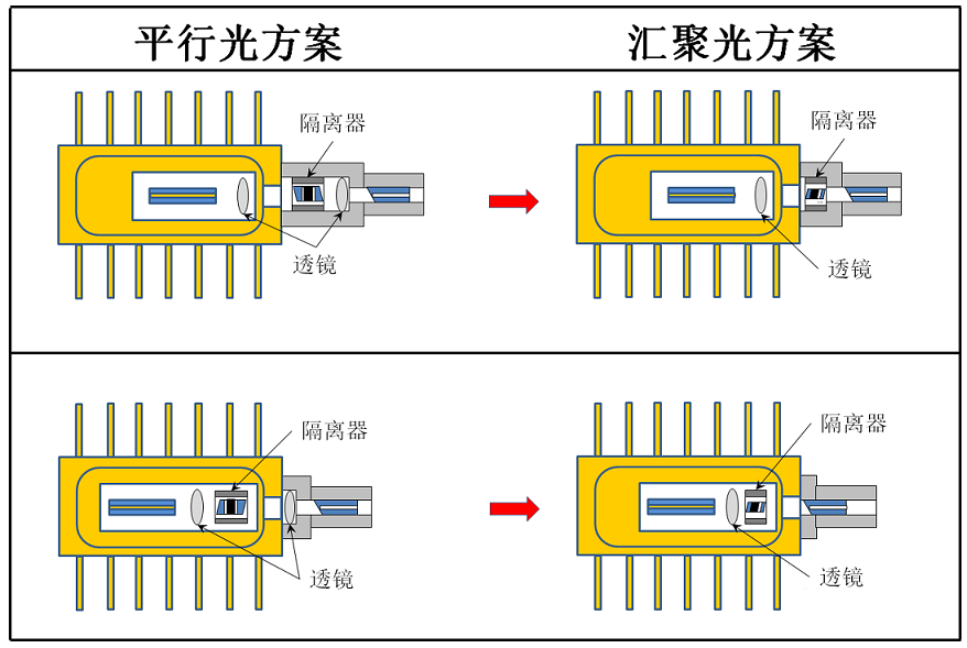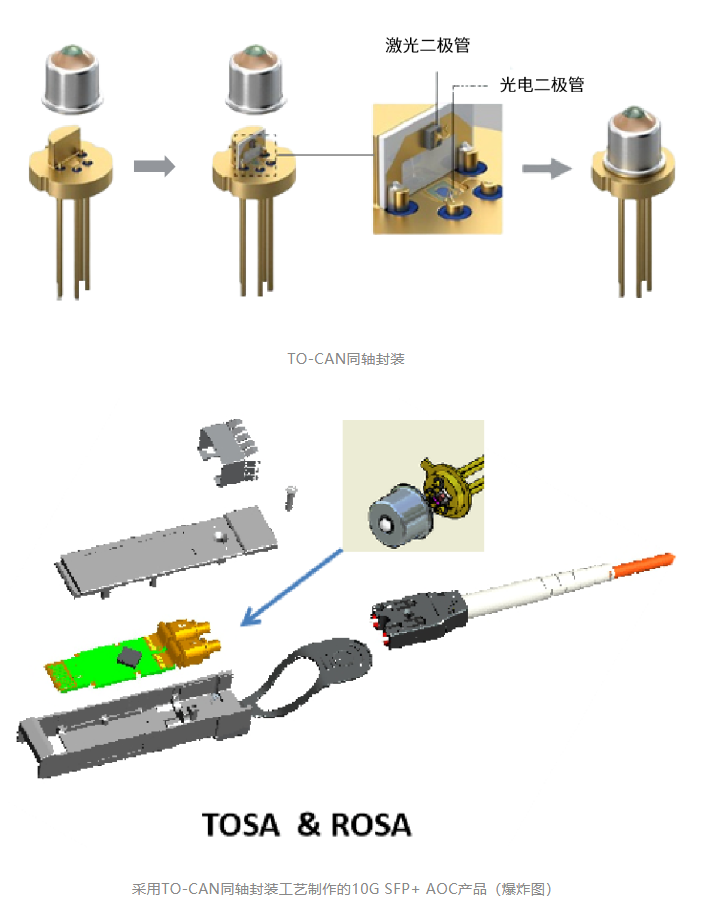 一般ROSA中封裝有分光器、光電二極管(將光信號(hào)轉(zhuǎn)換成電壓)和跨阻放大器(放大電壓信號(hào)),TOSA中封裝有激光驅(qū)動(dòng)器、激光器和復(fù)用器。TOSA、ROSA的封裝工藝主要有以下四種: