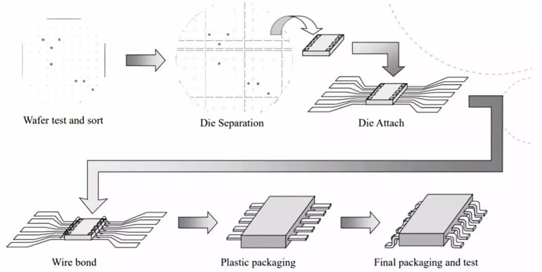 傳統(tǒng)電子封裝從最初的三極管直插時期后開始產(chǎn)生,其過程如下:將圓晶切割為晶粒(Die)后,使晶粒貼合到相應(yīng)的基架板觸墊(Leadframe Pad)上,再利用導線將晶片的結(jié)合焊盤與基板的引腳(Wire Bond)相連,實現(xiàn)電氣連接,最后用外殼小心加以保護。典型的封裝方式有:DIP,SOP,BGA等。