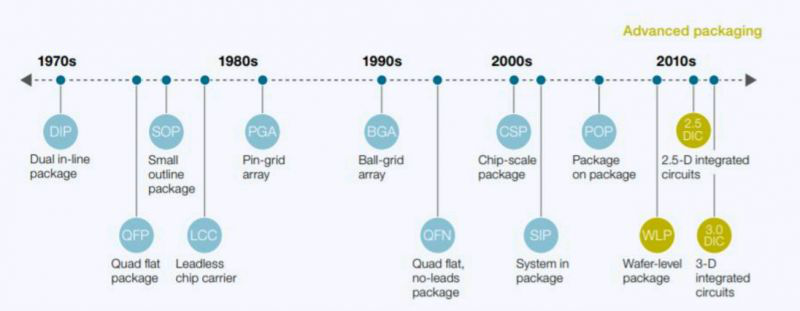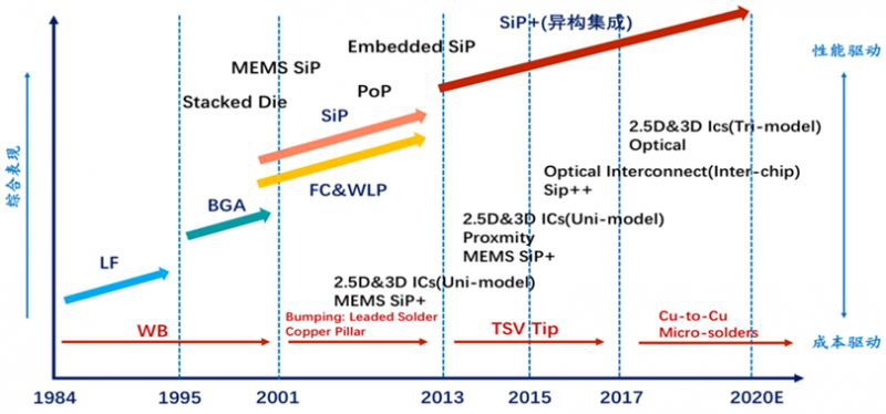 由于傳統(tǒng)封裝技術(shù)的封裝效率較低(裸芯面積/基板面積)較低,不能滿足電子器件的需求。在芯片制程受限的情況下,改進封裝技術(shù)是唯一的選擇。先進封裝技術(shù)通過以點帶線的方式實現(xiàn)電氣互連,實現(xiàn)更高密度的集成,大大減小了對面積的浪費。