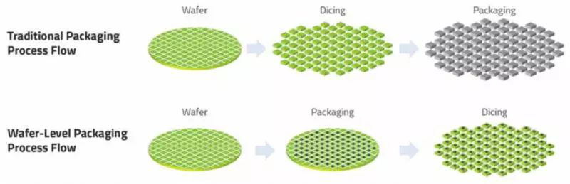 在傳統(tǒng)封裝概念中,晶圓是先被切割成小的晶粒,之后再進行連接和塑封。晶圓級封裝是對整片晶圓進行封裝測試后再切割得到單個成品芯片的技術(shù),封裝后的芯片尺寸與裸片一致。WLP具有兩大優(yōu)勢:①將芯片的I/O分布在IC芯片整個表面,使芯片尺寸達到微型化極限;②直接在晶圓片上對眾多芯片封裝、老化、測試,從而減少常規(guī)工藝流程,提高封裝效率。