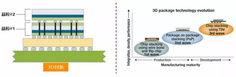 3D封裝是指芯片在Z方向(垂直方向)上的垂直互連結(jié)構(gòu)。3D封裝可以大幅度縮小尺寸,減輕40-50倍重量,提升一倍硅效率,同時縮短延遲,降低成本。目前3D封裝可通過引線鍵合、倒裝凸塊,POP(堆疊封裝)、TSV(硅通孔)技術(shù)實現(xiàn)。