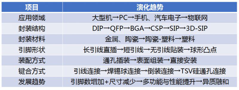 從上述封裝發(fā)展歷程上看,封裝結(jié)構(gòu)主要沿著DIP→QFP→BGA→CSP→3D-SiP方向演進。封裝結(jié)構(gòu)演化過程中封裝材料、引腳形狀、裝備方式以及鍵合方式也發(fā)生了相應(yīng)的變化,主要趨勢詳見下表。