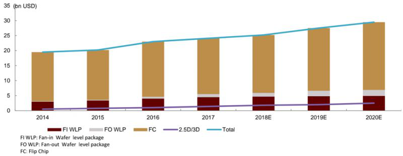 先進封裝產(chǎn)值占封裝總產(chǎn)值近一半,將引領(lǐng)未來發(fā)展。從全球封測市場產(chǎn)值看,據(jù)Yole數(shù)據(jù)顯示,2017年先進封裝產(chǎn)值超過20億美元,占全球封測總產(chǎn)值近一半市場。先進封裝由于可以提高封裝效率,降低封裝成本,提供更好的封裝性價比,將是未來封測行業(yè)的主要發(fā)展方向。