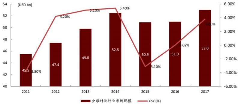 電子封裝行業(yè)屬于半導體產(chǎn)業(yè)鏈的下游,位于圓晶制造之后,電子制造電路組裝之前,是半導體行業(yè)鏈的必要一環(huán)。近年來,全球封測市場穩(wěn)步增長,根據(jù)Gatner數(shù)據(jù)統(tǒng)計,2017年全球半導體行業(yè)收入4204億美元,同比增長21.6%,其中封測行業(yè)收入占533億美元,同比增長7.0%,占半導體行業(yè)收入的13%。