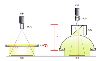 平面無影光源能提供高均勻度的漫射照明,可以消除產(chǎn)品表面不平整形成的干擾,成像效果與“圓頂+同軸光源組合”類似,且相比于組合光源而言,更節(jié)省空間。圖5為兩組光源的成像原理圖,左側(cè)為平面無影光源,右側(cè)為“圓頂+同軸”的組合光源。