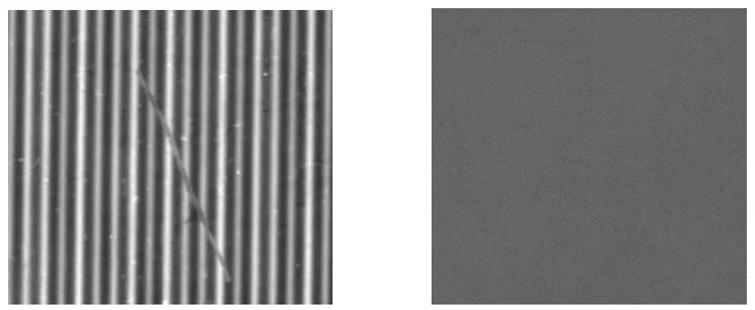 案例2:偏光膜表面變形與凹凸點(diǎn)檢測(cè)。圖11為平面條紋光源的成像圖。(a)為平面條紋光源檢膜材“變形”的效果,(b)為平面條紋光源檢“凹凸點(diǎn)”的效果,可以看到檢測(cè)圖片中有缺陷的地方條紋明顯形變,不再呈現(xiàn)出平行的特征。