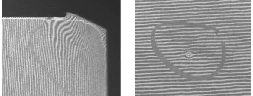 4)圓弧面缺陷,受弧面的影響導(dǎo)致視野不能做大,如用明視野法,則成像光斑非常??;用暗視野成像則對(duì)于缺陷方向有局限性;