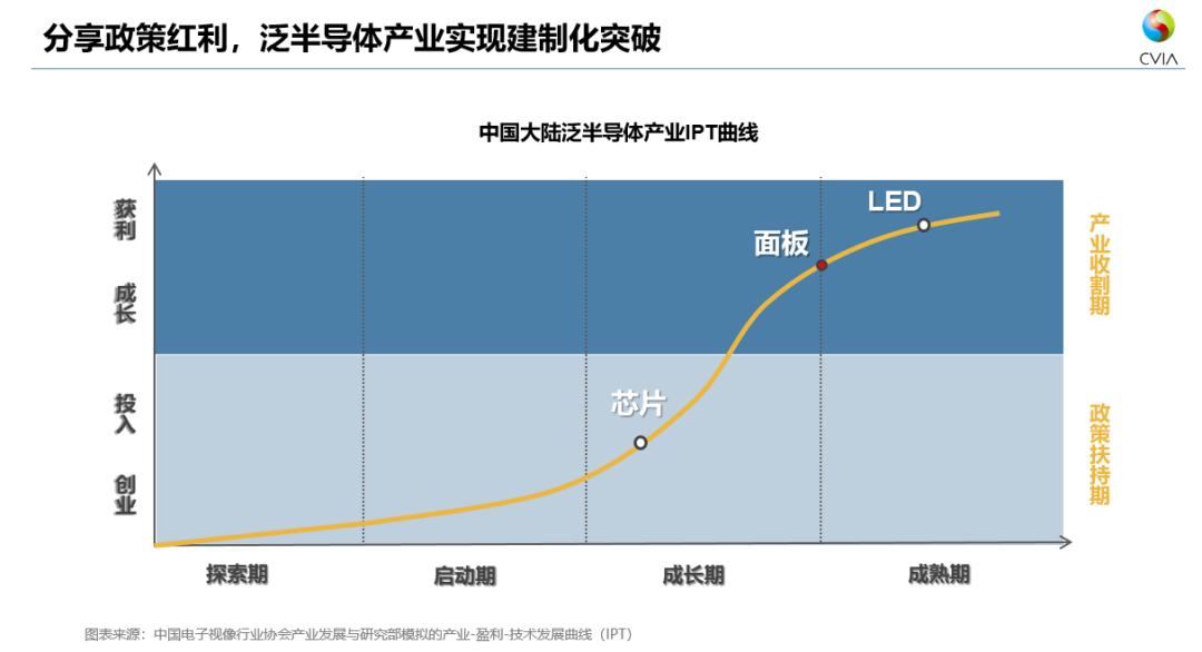泛半導(dǎo)體行業(yè)是對(duì)資本消耗無(wú)窮大的賽道,需要有國(guó)家級(jí)的支持。中國(guó)電子視像行業(yè)協(xié)會(huì)已進(jìn)行了長(zhǎng)期監(jiān)測(cè)。目前,芯片,面板,LED這三大泛半導(dǎo)體領(lǐng)域已經(jīng)實(shí)現(xiàn)了成建制突破。其中,面板和LED產(chǎn)業(yè)已經(jīng)處于成熟期,無(wú)論是技術(shù)還是獲利狀況都相對(duì)成熟。