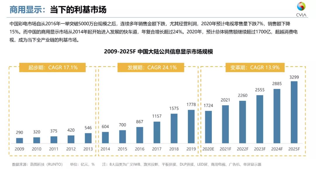 中國(guó)彩電市場(chǎng)自從2016年一舉突破5000萬(wàn)臺(tái)規(guī)模之后,連續(xù)多年下跌,尤其是經(jīng)營(yíng)利潤(rùn)。而中國(guó)的商用顯示市場(chǎng)從2014年起開(kāi)始進(jìn)入發(fā)展的快車(chē)道,年復(fù)合增長(zhǎng)超過(guò)24%。2020年,預(yù)計(jì)總體銷(xiāo)售額繼續(xù)超過(guò)1700億,繼續(xù)超越消費(fèi)電視,成為當(dāng)下全產(chǎn)業(yè)鏈的利基市場(chǎng)。