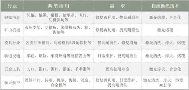 當(dāng)前,激光表面處理及增材制造技術(shù)、工藝和裝備被廣泛應(yīng)用于冶金、礦山機械、模具、石油電力、五金工具、軌交、航空航天、機械等行業(yè)。
