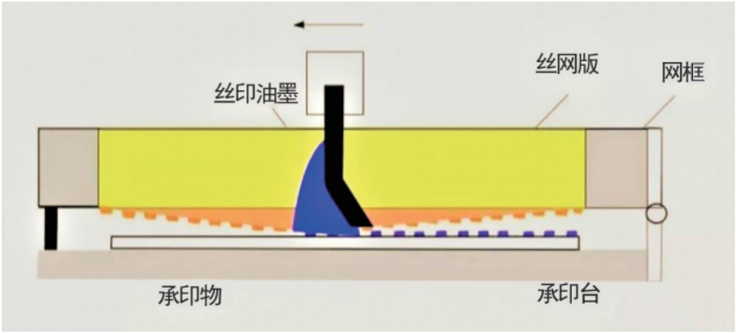 絲網(wǎng)印刷的原理是使圖文部分的油墨通過網(wǎng)孔轉(zhuǎn)移到承印物上形成印跡,其原理如下圖所示。絲網(wǎng)印刷包括平版絲網(wǎng)印刷和滾筒絲網(wǎng)印刷。平版絲網(wǎng)印刷的主要流程是將油墨置于絲網(wǎng)印版上,通過刮墨刀對其施加壓力,使油墨通過網(wǎng)孔轉(zhuǎn)移到承印物上;滾筒絲網(wǎng)印刷則是在滾筒上安裝印版,通過滾筒的轉(zhuǎn)動來帶動基底材料和印版并進行印刷。絲網(wǎng)印刷的操作成本低、工藝過程簡單、印刷圖案多樣化、承印物可選擇性等優(yōu)點使其在電子產(chǎn)品的制備中發(fā)揮了巨大作用,也受到了越來越多研究人員的關(guān)注。但是,絲網(wǎng)印刷得到的電子產(chǎn)品的質(zhì)量受多種因素的影響,如油墨、印刷速度、刮墨刀位置、承印物材料等。其中,油墨是影響產(chǎn)品質(zhì)量的關(guān)鍵因素。
