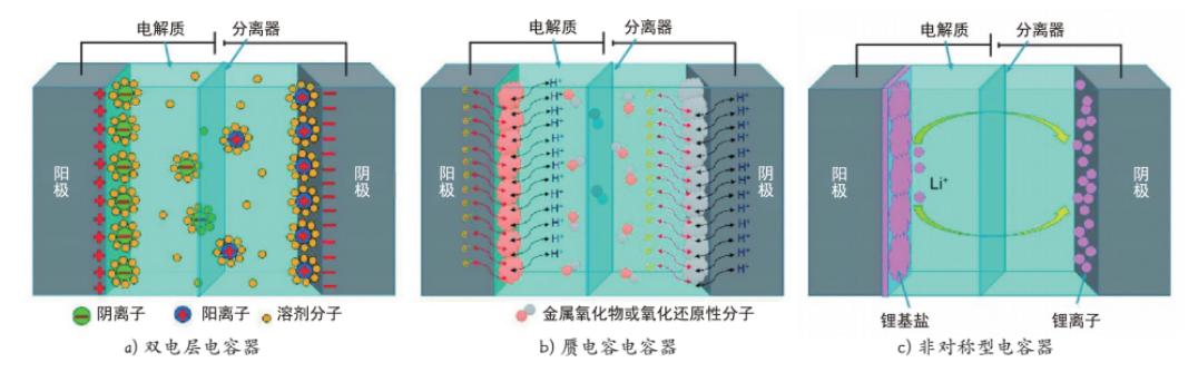 由于分類標準的差異,超級電容器有多種分類方法。首先,根據(jù)其工作原理的不同,如圖所示,超級電容器主要可分為雙電層電容器(EDLC)和贗電容電容器(PC);其次,根據(jù)電極結(jié)構(gòu),分為對稱型超級電容器和非對稱型超級電容器;最后,依據(jù)電解質(zhì)溶液類別,可分為水性電解質(zhì)和有機電解質(zhì)。