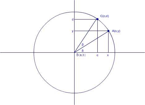 c=r*cos(δ+β)=r*cos(δ)cos(β)-r*sin(δ)sin(β)=xcos(β)-ysin(β)