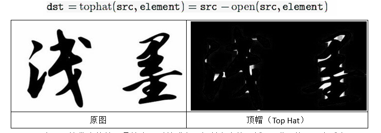 頂帽運(yùn)算(Top Hat)又常常被譯為”禮帽“運(yùn)算。為原圖像與上文剛剛介紹的“開(kāi)運(yùn)算“的結(jié)果圖之差,數(shù)學(xué)表達(dá)式如下:
