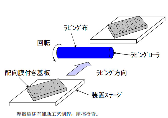 摩擦的作用是用絨布在PI 上摩過(guò),將PI 的側(cè)鏈?zhǔn)崂淼揭粋€(gè)方向。示意圖如下: