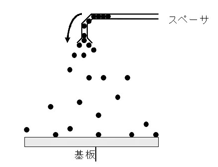 盒厚控制是靠選擇設(shè)定的球形襯墊料的直徑來(lái)實(shí)現(xiàn)的。襯墊料需要在貼合前均勻地噴灑到玻璃基板地表面,這是通過(guò)一種讓襯墊料帶電后干噴的設(shè)備完成的。其示意圖如下: