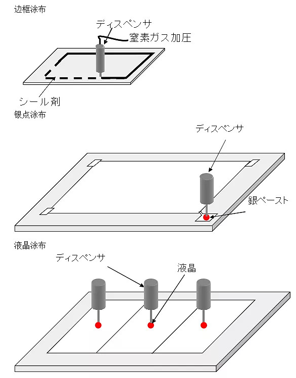 邊框料的作用有三:一是將CF 與TFT 基板粘結(jié)在一起;二是將盒厚固定下來(lái);三是將液晶限制在盒內(nèi)。銀點(diǎn)料的作用是導(dǎo)通 CF 和TFT 上的Common 電極。對(duì)ODF 工藝而言,邊框料和銀點(diǎn)料必須是采用快速固化的 UV 固化膠。液晶(Liquid Crystal)的作用是改變盒的光學(xué)狀態(tài)。這三種材料的涂布都是采用一種叫Dispensor 的涂布頭來(lái)完成的。其示意圖分別如下:
