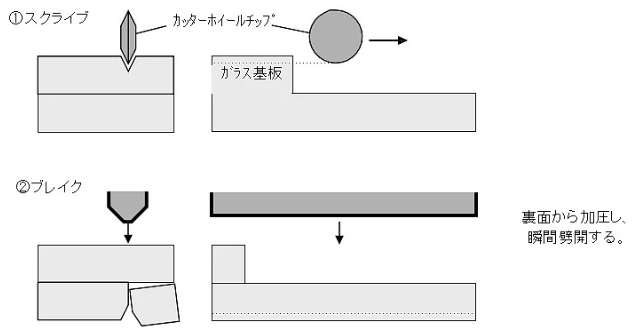 在產(chǎn)品盒制作完成后,需要將這些排列在一起的盒分割成獨(dú)立的屏。這個(gè)過(guò)程就稱為切割。切割是通過(guò)金剛刀輪在玻璃表面滑過(guò)來(lái)完成的。其原理圖如下: