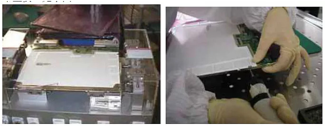 組裝是將背光源、屏、控制電路板、及觸摸屏等部件組合在一起,形成一個(gè)完整的顯示模塊。組裝一般是由手工來(lái)完成的,熟練的技術(shù)工人在這里非常重要。見(jiàn)下圖: