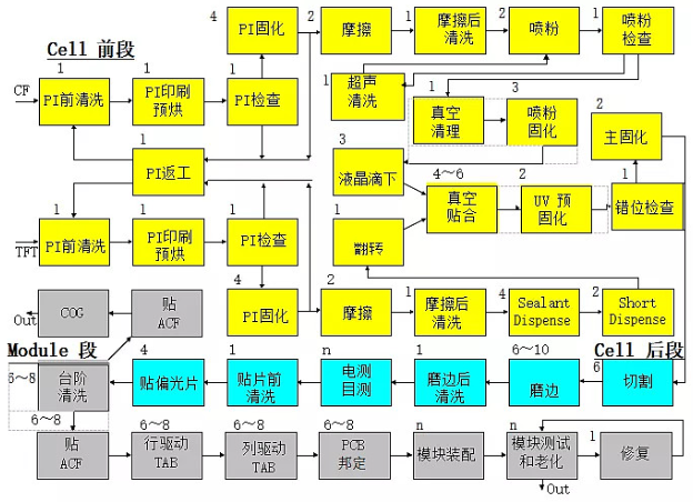 模塊段除去以上主要工藝制程外,還有一些輔助的工藝制程,如:激光切線,切線后電測(cè),邦定后電測(cè),組裝后電測(cè),切線后顯微鏡檢查,綁定后顯微鏡檢查或自動(dòng)光學(xué)檢查,IC 邦定后剪切力剝離測(cè)試,F(xiàn)PC 邦定后拉力剝離測(cè)試,組裝后加電老化,包裝出貨等。