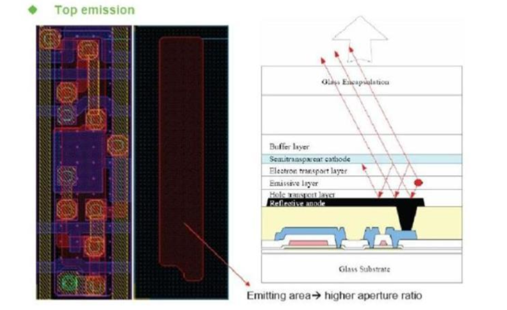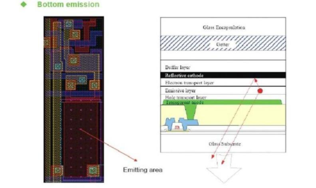 對(duì)應(yīng)到OLED顯示面板中,因?yàn)橛袡C(jī)發(fā)光層發(fā)出的光受限在陽極和陰極之間,當(dāng)選擇為反射陽極層和透明陰極層的時(shí)候,如圖2所示,光束將從封裝層側(cè)出射,構(gòu)成頂發(fā)射顯示裝置;而相應(yīng)地當(dāng)選擇為透明陽極層和反射陰極層的時(shí)候,如圖3所示,光束將從基板側(cè)出射,構(gòu)成底發(fā)射顯示裝置。