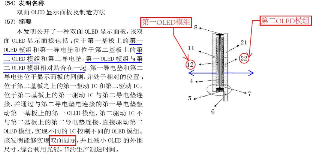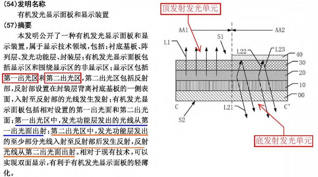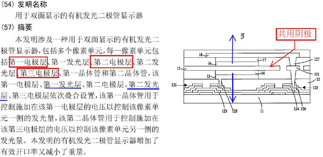 互補(bǔ)性雙面OLED顯示裝置,存在PPI較低的問題,其實(shí)通過并列頂發(fā)射發(fā)光單元和底發(fā)射發(fā)光單元,進(jìn)而在相對(duì)的兩個(gè)表面獲得出射光束,實(shí)現(xiàn)雙面顯示,具體的解決方案可參見專利CN108288633A: