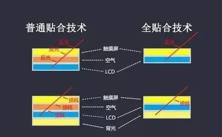 為了克服以上框貼的缺陷,全貼合技術(shù)誕生了。全貼合,即蓋板與Sensor或模組直接采用OCA(光學(xué)膠帶)、OCR(液態(tài)光學(xué)膠)或COF(熱可塑性光學(xué)膠)無(wú)縫貼合在一起。屏幕經(jīng)全貼合后,在強(qiáng)光或陽(yáng)光直射的情況下,仍能提供優(yōu)異的顯示效果,并且在可靠性方面也大大提高。