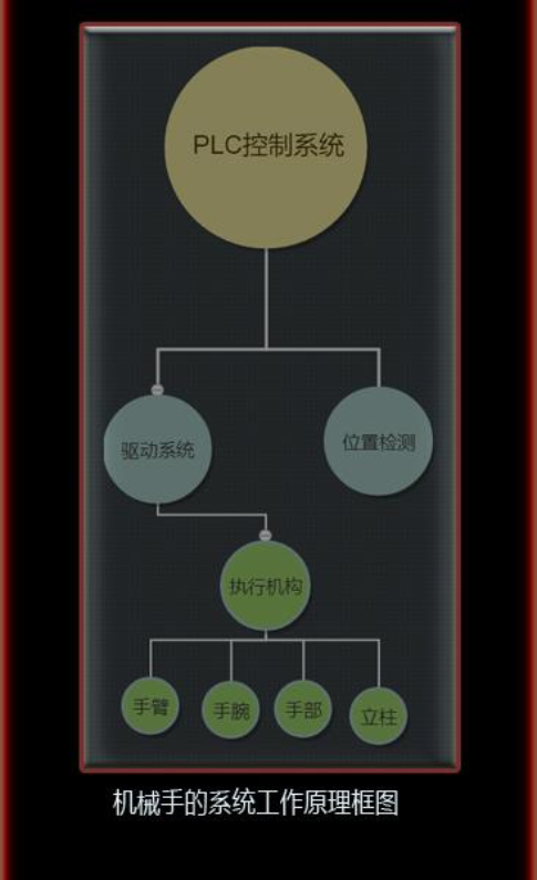 機械手的工作原理:機械手主要由執(zhí)行機構(gòu)、驅(qū)動系統(tǒng)、控制系統(tǒng)以及位置檢測裝置等所組成。在PLC程序控制的條件下,采用液壓傳動或者其他方式,來實現(xiàn)執(zhí)行機構(gòu)的相應(yīng)部位發(fā)生規(guī)定要求的,有順序,有運動軌跡,有一定速度和時間的動作。同時按其控制系統(tǒng)的信息對執(zhí)行機構(gòu)發(fā)出指令,必要時可對機械手的動作進行監(jiān)視,當動作有錯誤或發(fā)生故障時即發(fā)出報警信號。位置檢測裝置隨時將執(zhí)行機構(gòu)的實際位置反饋給控制系統(tǒng),并與設(shè)定的位置進行比較,然后通過控制系統(tǒng)進行調(diào)整,從而使執(zhí)行機構(gòu)以一定的精度達到設(shè)定位置.