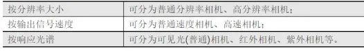 工業(yè)相機(jī)按照芯片類型、傳感器結(jié)構(gòu)特性、掃描方式、分辨率大小、輸出信號(hào)方式、輸出色彩、輸出信號(hào)速度、響應(yīng)頻率范圍等有著不同的分類方法。