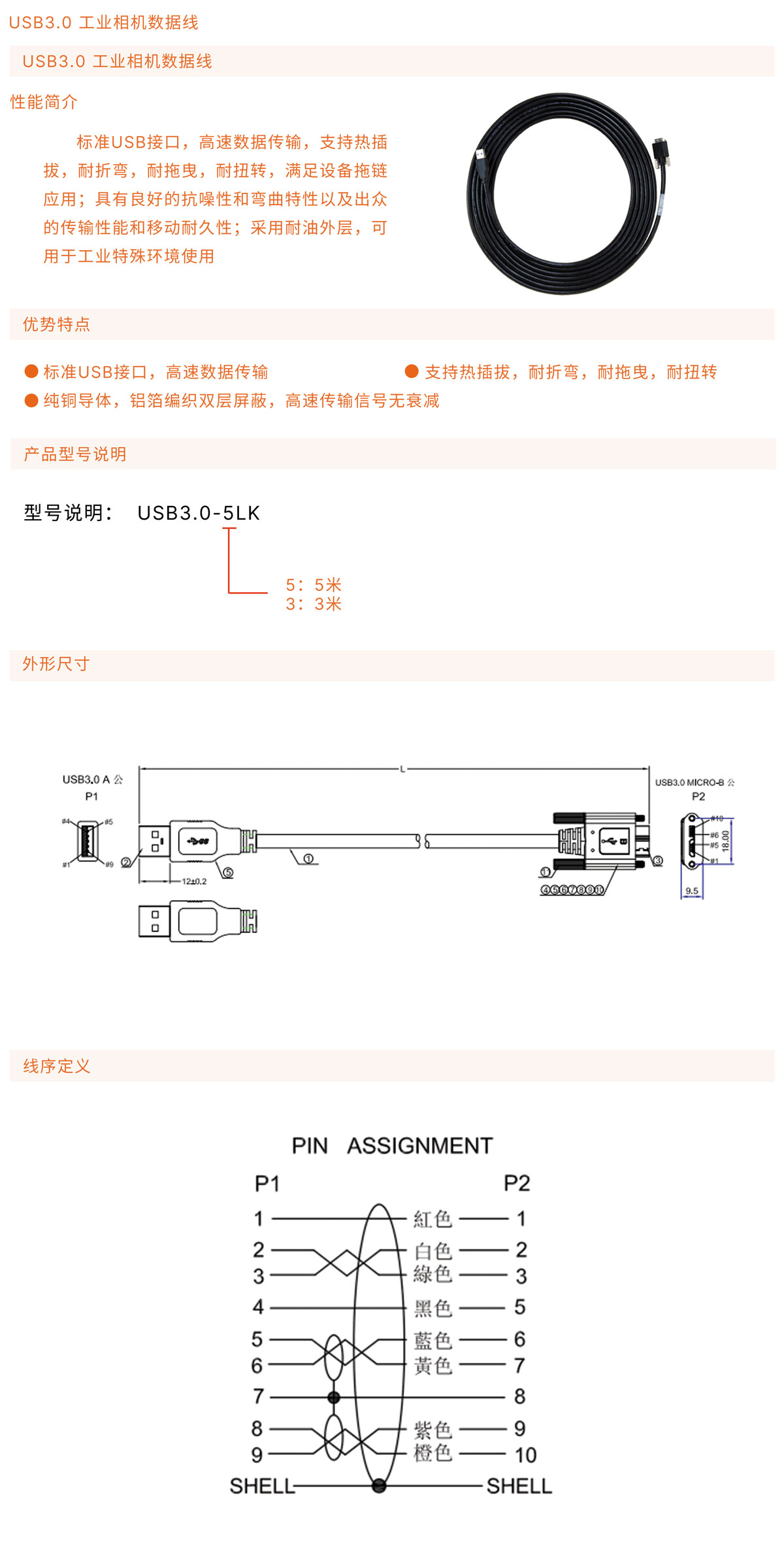 標(biāo)準(zhǔn)USB接口,高速數(shù)據(jù)傳輸,支持熱插拔,耐折彎,耐拖曳,耐扭轉(zhuǎn);具有良好的抗噪性和彎曲特性以及出眾的傳輸性能和移動耐久性 ;純銅導(dǎo)體,鋁箔編織雙層屏蔽,高速傳輸信號無衰減;采用耐油外層,可用于工業(yè)特殊環(huán)境使用;