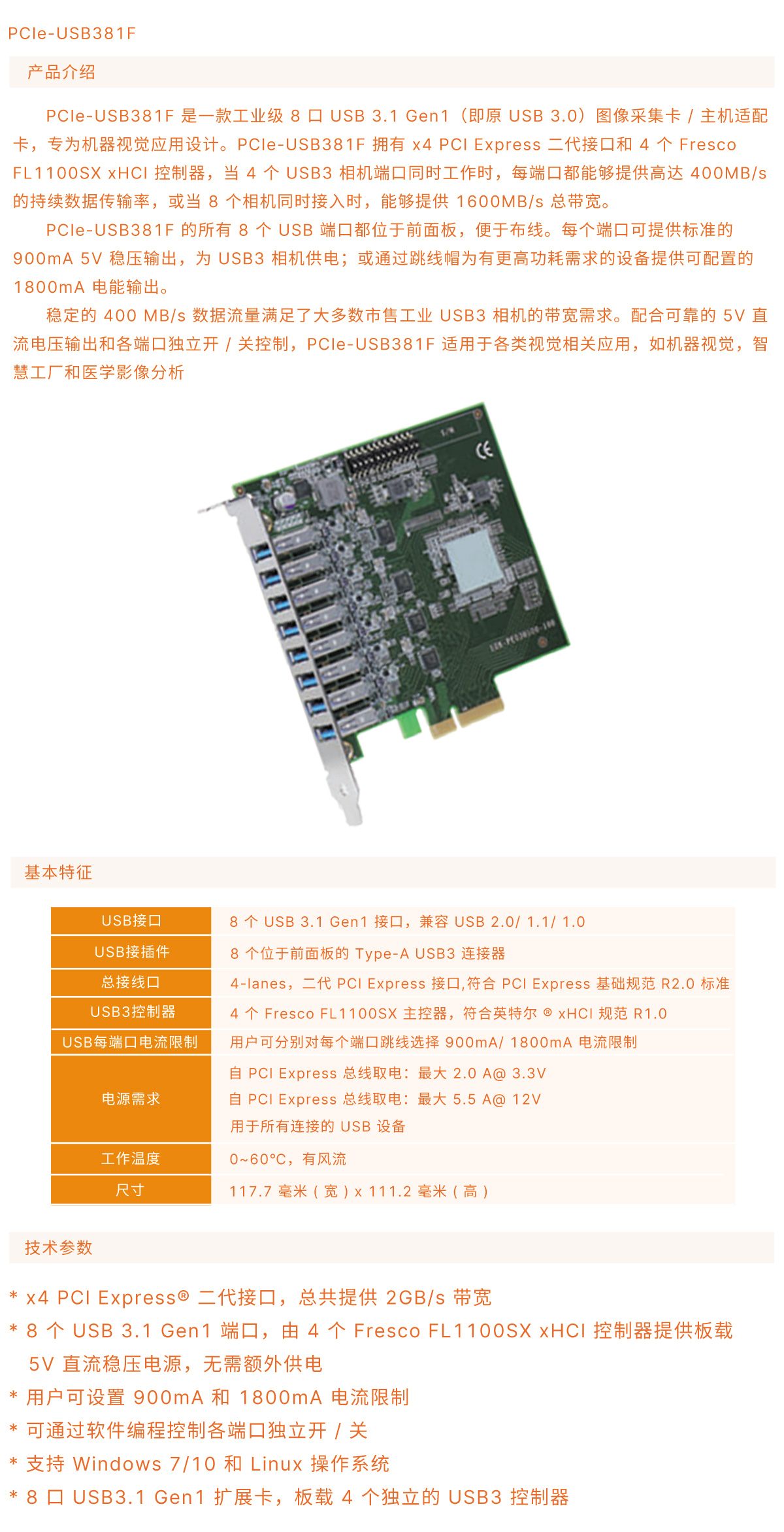 PCIe-USB381F 是一款工業(yè)級(jí) 8 口 USB 3.1 Gen1(即原 USB 3.0)圖像采集卡 / 主機(jī)適配卡,專為機(jī)器視覺(jué)應(yīng)用設(shè)計(jì)。PCIe-USB381F 擁有 x4 PCI Express 二代接口和 4 個(gè) Fresco FL1100SX xHCI 控制器,當(dāng) 4 個(gè) USB3 相機(jī)端口同時(shí)工作時(shí),每端口都能夠提供高達(dá) 400MB/s 的持續(xù)數(shù)據(jù)傳輸率,或當(dāng) 8 個(gè)相機(jī)同時(shí)接入時(shí),能夠提供 1600MB/s 總帶寬。